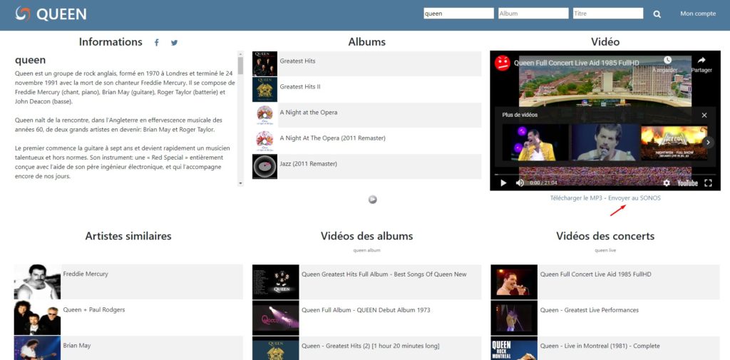 Pour rappel, j’ai développé une application pour écouter de la musique (les sources sont dispos ici), et qui permet maintenant de télécharger la musique via youtube-dl et de la transférer en un clic au sonos. Je vous laisse essayer. A noter que la version en ligne ne fonctionnera pas pour vous et que vous devrez installer l’application sur votre serveur pour profiter de tout ça.