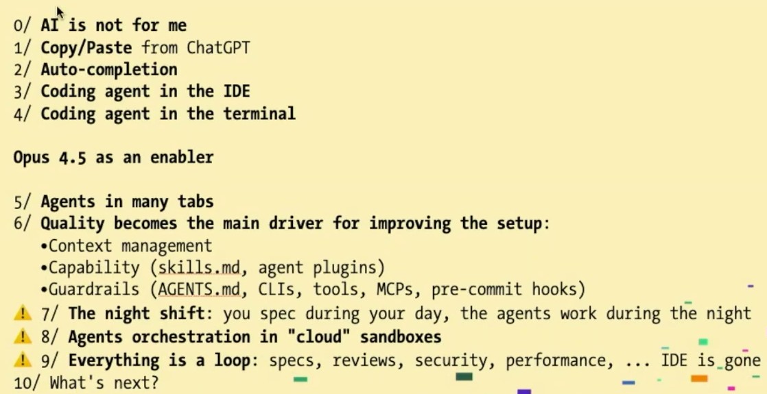 On aurait pu appeler cet évènement l’IA Live tant la place prise par l’intelligence artificielle était importante. Claude semble aujourd’hui intégré dans toutes les équipes de dév. Si je devais choisir uniquement un sujet à approfondir, je vous recommanderais celui sur l’IA et l’intégration dans votre workflow de développement. Entre faire du copier coller de ChatGPT, et avoir un assistant de codage qui envoie les Pull Request à votre place, il y a quand même quelques marches à appréhender. Pour illustrer mon propos, je vais reprendre cette slide de Fabien Potencier qui montrait les grandes étapes qu’il va nous falloir acquérir. Personnellement, je n’en suis encore qu’à la 4.
